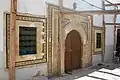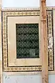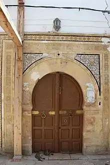 الباب الخارجي الكائن بنهج العيساوية يتوسط شباكين كبيرين وتحتوي هذه الواجهة نقشا بديعا من الطراز المغربي الذي هو أصل الولي فهو الشيخ سعادة من مريدي سيدي محمد بن عيسى المغربي وصاحب الطريقة العيساوية.