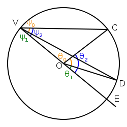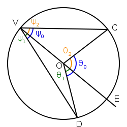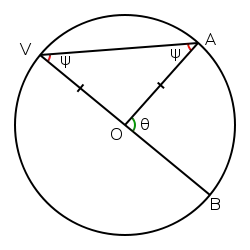 أعطي الزاوية المركزية BOA اسم θ. أرسم خط OA. لاحظ أن خطي OV وOA هما شعاعي الدائرة، لذا هما متساويين. لذلك، فإن المثلث VOA هو متساوي الضلعين وبالتلي، فإن الزاويتين BVA وVAO متساويتان. سمي كل منهما بـ ψ.