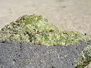 الزبرجد الزيتوني مع بيروكسين ثانوي ، بازلت حويصلي. (مجال الرؤية = 35 مم)