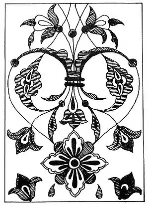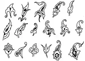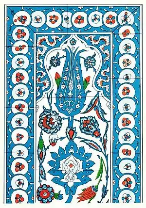 الزخرفة النباتية يُستخدم فيها أنواع كثيرة من النباتات والورود والأزهار كالقرنفل والكرز والرمان وزهرة التوليب (الخزامى) والسوسن والنسرين. وتتكون من الأغصان والسيقان والأوراق
