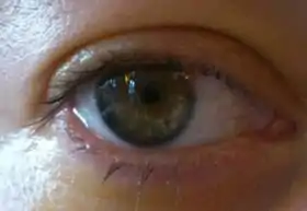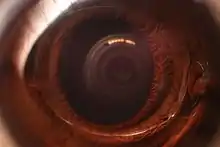 ![]() صورة العين بعد 24 ساعة من جراحة زراعة العدسة. العدسة مرئية أمام القزحية، ولا يزال البؤبؤ صغيرًا بسبب قطرة العين قبل الجراحة. | |