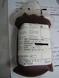 ![]() وحدة دم من الخلايا الجذعية قبل نقلها لمريض | |