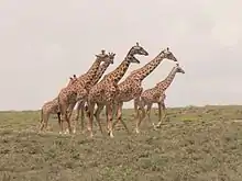 - الزَّرافة الماساويَّة، G. c. tippelskirchi:[23] أو زرافة الماساي، أو زرافة كليمنجارو، تنتشرُ في أواسط وجنوب كينيا وفي تنزانيا.[24] لطخات جسدها مُميَّزة تجعلها فريدة بين باقي الزرافى، فهي مُسننة ونجميَّة الشكل وتمتدُ حتّى الحوافر. ونُتوءُ الجُمجمة بارزٌ عند الذكور عادةً.[25]:54[31] يُعتقدُ بأنَّ منها 40,000 رأس في البريَّة،[24] وحوالي 100 في حدائق الحيوان.[28]