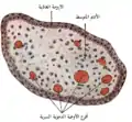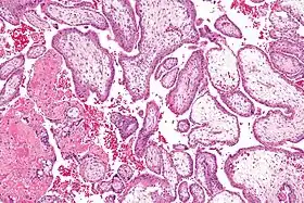 ![]() صورة مجهرية تظهر الزغابات المشيمية. تكبير متوسط. صبغة الهيماتوكسيلين والأيوزين. | |