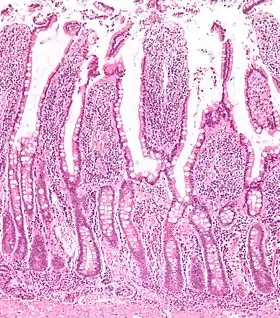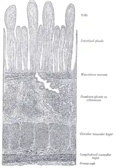![]() صورة مجهرية of the أمعاء دقيقة غشاء مخاطي showing intestinal villi - top half of image.[1][1] صبغة الهيماتوكسيلين واليوزين | |