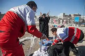 فحسب المدير العام للصحة والعلاج لجمعية الهلال الأحمر الإيرانية تمّ إرسال الفرق الصحية جنبا إلى جنب مع فرق الإنقاذ لتقديم الخدمات والإغاثة للمتضررين.[27] ووفقاً لرئيس منظمة الإغاثة والإنقاذ لجمعية الهلال الأحمر الإيرانية تمّ إرسال 26 ألف بطانية و10 آلاف خيمة إلی المنطقة.[28] كذلك بادر أهالي العاصمة الإيرانية طهران بالتوجه نحو مراكز تبرع الدم، من أجل الجرحى والمصابين.[29]