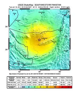 زلزال باكستان 2011 زلزال بقوة 7.2 على مقياس ريختر ضرب باكستان وهز الهند وإيران ودبي والبحرين[3].ويقع محل بؤرة الزلزلة على الحدود الباكستانية الأفغانية على بعد 45 كم غرب دالبندین الباكستانية و300 كم عن زاهدان الإيرانية.وقال المركز الوطني للأرصاد الجوية والزلزال في الإمارات أن الزلازل كان محسوسا رغم بعده 900 كم عن البلاد لكنه لم ينجم عنه اي اضرار.[4]