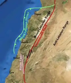 يقع لبنان إلى جانب صدع البحر الميت الذي يشكل جزءًا من الحدود بين الصفيحة العربية والصفيحة الأفريقية. تشكل منطقة الصدع في لبنان منحنىً حاجزًا يرتبط تمامًا بموقع الصدع. شكل هذا الصدع المرتبط بالحاجز عددًا من الهزات مثل التي حصلت مؤخرًا في جبل لبنان وفُسرت على أنّها حدثت في قاع البحر بعيدًا عن الشاطئ.[2]