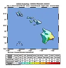 ![]() خريطة تظهر توزع الاهتزازات في هاواي نتيجة الزلزلال. |