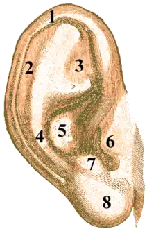 ![]() رسم للأذن الخارجية، حيث تظهر الزنمة (رقم 6) | |