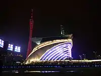 دار أوبرا غوانزو هي دار للأوبرا الصينية وأكبر مركز عروض فنية في جنوب الصين، تم افتتاحها في مدينة غوانزو بالصين عام 2010، لتُصبح أكبر دار أوبرا في جنوب الصين وثالث أكبر دار أوبرا في الصين بعد المركز الوطني ببكين للفنون المسرحية ومسرح شنغهاي الكبير. يمتد المشروع على مساحة 70,000 مترًا مربعًا في قلب مدينة غوانزو. وحاز تصميم حديد المسماة الحصاة المزدوجة على حق تشييد الدار،[58] وتم وضع حجر الأساس في وقت مبكر من عام 2005.[59] وقد بلغت الكلفة الإجمالية للمشروع 1.38 مليار يوان، أي ما ما يقارب 200 مليون دولار أمريكي.[60][61]