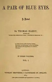 "زوج من العيون الزرقاء" هي ثالث رواية نشرت لهاردى وأول رواية حملت اسمه، تم نشرها لأول مرة على حلقات في مجلة تينسلى في الفترة بين سبنمبر 1872 ويوليو 1873.
