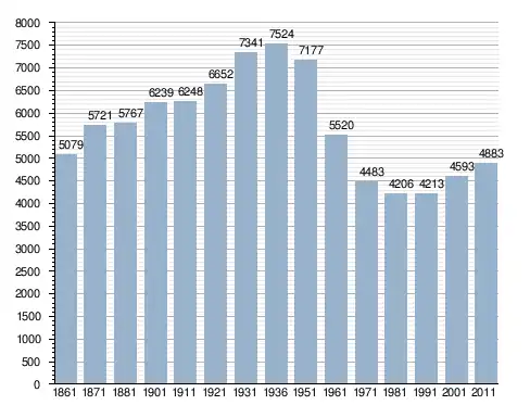 في سنة 1861 بلغ عدد السكان 5٬079 نسمة، وتطور العدد ليصل في سنة 2011 لـ 4٬883 نسمة.