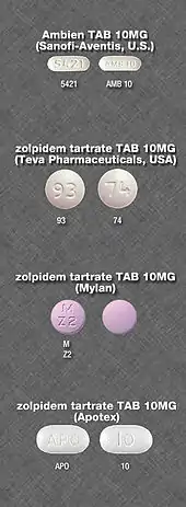 - "Ambien". The American Society of Health-System Pharmacists. مؤرشف من الأصل في 18 أغسطس 2018. اطلع عليه بتاريخ 03 أبريل 2011. الوسيط
