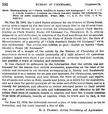 أصدرت محكمة المقاطعة الأمريكية في تقرير لعام 1917 لولاية رود آيلاند قرارًا بغرامة 20 دولار على كلارك استانلي لسوء التسويق التجاري لماركته "مرهم كلارك استانلى من زيت الثعبان" تركيبة أدوية زيت الثعبان يختلف بشكل ملحوظ بين المنتجات. زيت ثعبان استانلي ـ الذي أنتجه كلارك استانلي، الملقب بـ " ملك الأفعى الجرسيّة" ، تم اختباره من قبل حكومة الولايات المتحدة ووجدت أنه يحتوى [2]