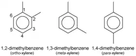 من اليمين: بارا-زايلين، ميتا-زايلين، أورثو-زايلين