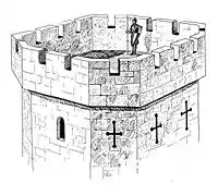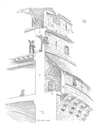 تُسمى العروض المصمتة بين الجدران بالثلمات. تحمي زينة الشرفة الموجودة على الجدران الممرات (الممشى) الواقعة خلفها. يُستخدم السطح الذي يكون في الغالب مستويًا على أسطح البرج أو المباني كمنصة قتال محمية.