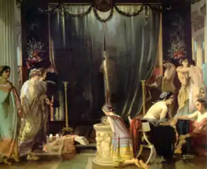 اشتهر برسم تجمع الآلهة، وإيروس، المتوجة بالورود، وألسمين [الإنجليزية]، ومينيلوس، وأحد الرياضيين، وبان، ومارسياس، المكبلة بالسلاسل، والمرأة العجوز.