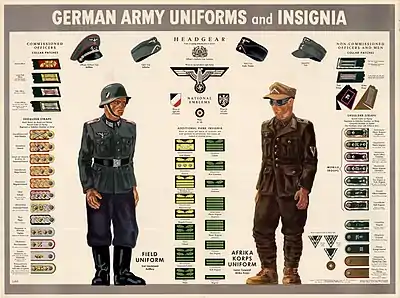 ملصق ملون يوضح شارات الجيش الألماني وشاراته وقبعاته وأزياءه. يحتوي الملصق على شخصين: أحدهما جندي ألماني يرتدي الزي الرسمي الأخضر الرمادي والأخر لجندي ألماني يرتدي الزي المدرسي الأخضر الزيتوني الاستوائي (Afrika Korps). كما تم تصوير الشعارات الوطنية التي تلبس على القبعات.