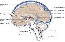 ![]() صورة تظهر موقع السائل الدماغي الشوكيّ و تظهر بطينات الدماغ صورة تظهر موقع السائل الدماغي الشوكيّ و تظهر بطينات الدماغ | |
