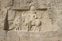 صورة يظهر فيها سابور فارساً والإمبراطور جاث أمامه وهى في النقوش التي تعرف في إيران اليوم باسم نقش رستم.