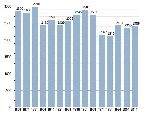 في سنة 1861 بلغ عدد السكان 2٬850 نسمة، وتطور العدد ليصل في سنة 2011 لـ 2٬406 نسمة.