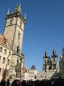 تضم الساحة مبان ذات طرازات معمارية عديدة، ومن ضمنها كنيسة سيدة تين القوطية، والتي كانت الكنيسة الرئيسية في هذا الجزء من المدينة منذ القرن الرابع عشر. يبلغ طول أبراج الكنيسة 80 مترا. ساعة براغ الفلكية (Pražský orloj) هي ساعة فلكية من القرون الوسطى وتقع على جدار البلدية القديمة. تم تركيب الساعة في عام 1410، مما يجعلها ثالث أقدم ساعة فلكية في العالم وأقدم واحدة لا تزال تعمل.