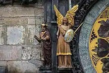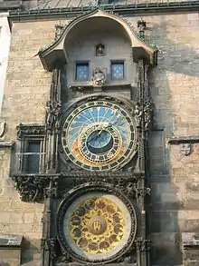 هي التي شنت على ورلوغ على الحائط الجنوبي من قاعة المدينة القديمة في ساحة البلدة القديمة. والآلية على مدار الساعة وتتكون نفسها من ثلاثة عناصر رئيسية هي: الاتصال الهاتفي الفلكية، التي تمثل موضع الشمس والقمر في السماء، وعرض مختلف التفاصيل الفلكية. "ذا ووك الرسل"، وتصورها عرض ساعة من الشخصيات من الرسل وغيرها من المنحوتات وخاصة تحريك شخصية من الموت (ويمثلها هيكل عظمي) ضرب الزمن؛ وتقويم الهاتفي مع الميداليات التي تمثل أشهر. وفقا لأسطورة محلية، ستعاني المدينة إذا أهمل على مدار الساعة، ويتم وضعها عملها جيدة في خطر وشبح، التي شنت على مدار الساعة، وكان من المفترض أن إيماءة رأسه في التأكيد. ووفقا للأسطورة، وكان يمثل الأمل الوحيد صبي ولد في ليلة رأس السنة الميلادية