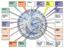 تمثل الخلفية الأرض والعرض المحلي من السماء. الدائرة الزرقاء مباشرة في وسط تمثل الأرض، والأزرق العلوي هو جزء من السماء التي فوق الأفق. تشير المناطق الحمراء والسوداء أجزاء من السماء تحت الأفق. خلال النهار، الشمس تجلس على الجزء الأزرق من الخلفية وفي الليل تجلس على الأسود. خلال الفجر أو الغسق، تم وضع الشمس الميكانيكية على الجزء الأحمر من الخلفية.
