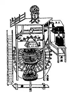 استخدام الساعة المائية لصنع آليات توضح الظواهر الفلكية بدأت مع تشانغ هنغ (78-139) في 117، والذي وظّف أيضا دولاب الماء. [24] وكان تشانغ هنغ هو الأول في الصين الذي يضيف خزان تعويض إضافي بين الخزان وتدفق الوعاء، والتي حلت مشكلة وقوع رأس الضغط في الخزان الأحتياطي.[20] براعة تشانغ أدت إلى خلق ساعة تعمل على عجلة ماء مع أداة تساعد على الحركة في إتجاه واحد من قبل يي شينغ (683-727) ويانغ لينجزان في 725.[25] نفس الآلية استخدمها سونغ سو (1020-1101) في عام 1088 ليشغل ساعته الفلكية البرج، فضلا عن البدلات. [26] برج الساعة التابع لسونج سو، طوله أكثر من 30 قدم، ويمتلك كرة برونزية تحرّك يدوياَ للملاحظات، وكرة دائرية تتحرك بشكل أوتوماتيكي، وخمس لوحات أمامية مع أبواب تسمح بعرض التغييرات في الدمية التي تقرع الأجراس، وحملت ألواح تشير إلى الساعة أو غيرها من الأوقات الاستثنائية لليوم.