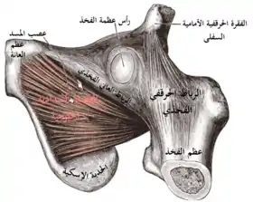 • العضلة موترة اللفافة العريضة * • الألوية العظمى • ألياف اللفافة العريضة * • الألوية الصغرى • العضلة الكمثرية • العضلة السدادية الباطنة |