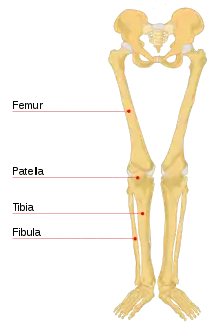 العظام الرئيسية للساق هي عظم الفخذ (عظم الفخذ)، عظم الساق، والشظية المجاورة، وجميعها عظام طويلة. الرضفة هي العظم السمسمي الموجود أمام الركبة. معظم الهيكل العظمي للساق له نتوءات وحواف عظمية يمكن ملامستها وبعضها يعمل كمعالم تشريحية تحدد امتداد الساق. هذه المعالم هي الشوكة الحرقفية العلوية الأمامية، المدور الكبير، الهامش العلوي للقمة الإنسية للظنبوب، والكعب الإنسي.[8] من الاستثناءات الملحوظة للجس مفصل الورك وعنق عظم الفخذ والجسم أو جذع عظم الفخذ.