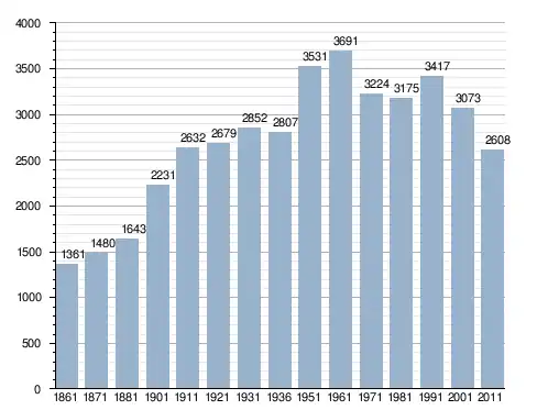 في سنة 1861 بلغ عدد السكان 1٬361 نسمة، وتطور العدد ليصل في سنة 2011 لـ 2٬608 نسمة.