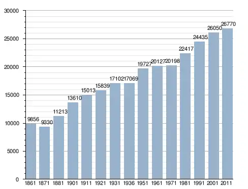 في سنة 1861 بلغ عدد السكان 9٬856 نسمة، وتطور العدد ليصل في سنة 2011 لـ 26٬770 نسمة.
