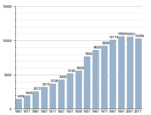 في سنة 1861 بلغ عدد السكان 1٬459 نسمة، وتطور العدد ليصل في سنة 2011 لـ 10٬289 نسمة.