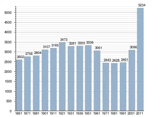 في سنة 1861 بلغ عدد السكان 2٬602 نسمة، وتطور العدد ليصل في سنة 2011 لـ 5٬234 نسمة.