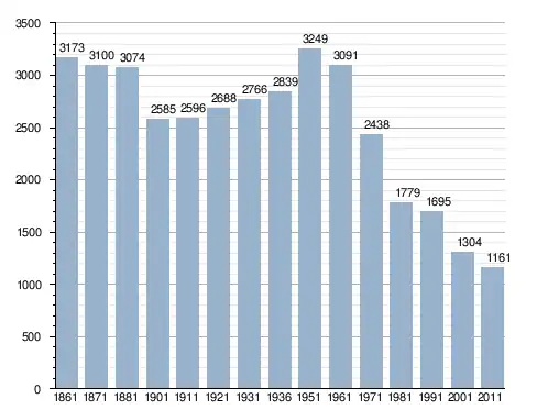 في سنة 1861 بلغ عدد السكان 3٬173 نسمة، وتطور العدد ليصل في سنة 2011 لـ 1٬161 نسمة.