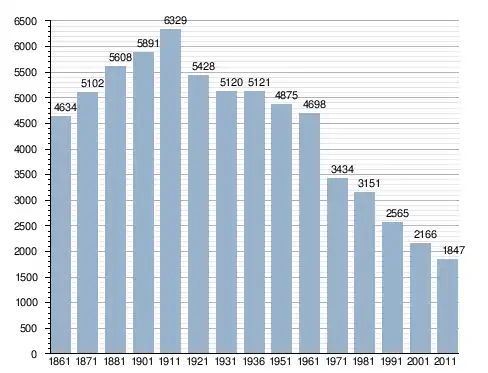 في سنة 1861 بلغ عدد السكان 4٬634 نسمة، وتطور العدد ليصل في سنة 2011 لـ 1٬847 نسمة.