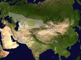 ![]() الانتشار التاريخي لظباء السايغا (باللون الأبيض) والانتشار الحالي لتحت نوعيه: السايغا التتري (الأخضر) والمنغولي (الأحمر) | |