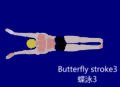 سِبَاحَةُ الفَرَاشَةِ[1] (بالإنجليزية: butterfly stroke) (معروفة بالعامية بين السباحين باسم 'يطير'[2]) وضع الجسم في هذا النوع يأخذ الوضع الأفقي كما في الزحف على البطن، ثم يتحول الوضع الأفقي للتموج لأعلى وأسفل بمجرد بدء أداء حركات الرجلين وثقل الحركة التموجية في الجزء العلوي من الجسم.