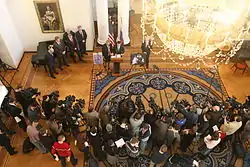 احتشدت كاميرات التلفزيون في غرفة الثريا في سباسو هاوس ، حيث أعلن السفير بيرل عن عودة ميدالية تعود إلى عائلة القيصر التي سُرقت من هرميتاج واستعادتها عملية مشتركة بين سلطات إنفاذ القانون الروسية والأمريكية