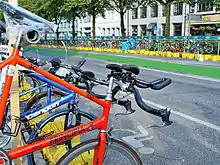 إحدى القواعد التي تتضمن ساق الدراجة هي أنه يجب ارتداء خوذة المنافس قبل أن يتسلق المنافس (أو حتى يستحوذ عليها ، في بعض الولايات القضائية[49]) الدراجة النارية ويجب أن تظل على متنها حتى ينزل المتسابق ؛ قد لا يُطلب من المتسابق ارتداء الخوذة عندما لا يكون على الدراجة (على سبيل المثال أثناء إصلاح مشكلة ميكانيكية). سيؤدي عدم الامتثال لهذه القاعدة إلى فقدان الأهلية.[44][48] بالإضافة إلى ذلك ، أثناء السير على مسار الدراجة ، يجب دفع جميع الدراجات بقوة بشرية وقوة بشرية فقط. بخلاف دفع الدراجة ، يُحظر أي عمل دفع ناتج عن استخدام اليدين. في حالة تعطل دراجة أحد المنافسين ، يمكنه المضي قدمًا في السباق طالما أنه يقوم بذلك مع دراجته في القطر.[44] هناك أيضًا قواعد صارمة فيما يتعلق بخط "تركيب الدراجة". لا يجوز للمتسابقين بدء ركوب دراجتهم خارج المرحلة الانتقالية حتى يتجاوزوا خطًا محددًا بوضوح. قد يؤدي تركيب الدراجة قبل ذلك إلى فرض عقوبة (على سبيل المثال: تم منح عقوبة مدتها 15 ثانية في أولمبياد لندن 2012 إلى جوني براونلي ، وهو منافس من بريطانيا العظمى ، بسبب دراجته في وقت مبكر جدا).[48][50]