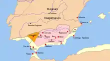 هناك عدد قليل من المدن التي يمكن اعتبارها بكل ثقة أنها كانت خاضعة للحكومة البيزنطية في تلك الفترة. ظلت مدينة مدينا سيدونيا (أسيدونا) حتى عام 572، عندما استعادها ليوفيجيلد . وأيضًا Gisgonza (المعروفة كذلك باسماء Gigonza Sagontia القديمة)[10] تم الاحتفاظ به حتى عهد Witteric (603-610) ويشير إلى أن جنوب مقاطعة باطقة كان بالكامل بيزنطيًا من مالقة إلى مصب غواداليتي. وفي مقاطعة قرطاجنسي، حيث كانت تقع قرطاجنة وعاصمتها، كانت مدينة بازا أيضًا بيزنطية، وربما قاومت غارات ليوفيغيلد في تلك المنطقة في 570، مع أنها كانت للقوط الغربيين بحلول 589.