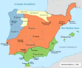 في عام 409، عبر الواندال، والسويبيين والألان، الذين اخترقوا الدفاعات الحدودية الرومانية على نهر الراين قبل عامين، عَبر جبال البيرينيه إلى شبه الجزيرة الأيبيرية. ومع ذلك، تم الحفاظ على الحكم الروماني الفعال في معظم المناطق حتى بعد وفاة الإمبراطور ماجوريان في عام 461.[2] لقد ملأ القوط الغربيون، التابعون للإمبراطورية الرومانية الذين استقروا في آكيتين بدعوة إمبريالية (416)، الفراغ المتزايد مع انتقال الواندال إلى شمال أفريقيا. وفي عام 468 هاجموا وهزموا السويبيين، الذين احتلوا غالايسيا الرومانية وكانوا يهددون بالتوسع. لقد أنهى القوط الغربيون الإدارة الرومانية في إسبانيا في عام 473، وجرى إنشاء سيطرتهم على معظم أجزاء شبه الجزيرة الشرقية والوسطى بحلول عام 476. بدأت هجرة القوط الغربيين على نطاق واسع إلى أيبيريا في عام 494 تحت حكم ألاريك الثاني حيث أصبحت مقر قوتهم بعد أن فقدوا معظم أراضيهم في بلاد الغال إلى الفرنجة بعد معركة فويلي في عام 507.