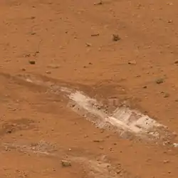 كانت العجلة الأمامية المعطلة لسبيريت نقمة ونعمة في نفس الوقت، ففي الوقت الذي كان الجوال مضطرا إلى سحبها أثناء حركته كانت بدورها تزيل الطبقة الخارجية من التربة تاركة خندقا خلفها . ففي أحد الأيام أي في السابع من مارس 2007 لفت انتباه العلماء منطقة ناصعة البياض قد تكشفت من أسفل سطح التربة، وبعد معاينتها تبين للعلماء أنها غنية بالسيليكا (المكون الرئيسي لزجاج النوافذ)حيث يعتقد أنها تكونت بإحدى الطريقتين : إما نتيجة تحلل السيليكا بواسطة المياه الينابيع الحارة ثم نقلت إلى موقع آخر حيث ترسبت هناك أو نتيجة تخلل المياه الحامضية بين شقوق الصخور حيث اغتسلت المكونات المعدنية لها وتركت السيليكا خلفها .