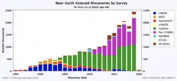 تظهر الصورة مقارنة بأعداد الأجرام القريبة من الأرض التي تم اكتشافها من مختلف المشاريع ويظهر مشروع سبايس واتش باللون الأحمر.