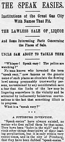 يعتقد أن بداية استخدام اللفظ كانت في بنسلفانيا عام 1888. عندما صدر قانون بزيادة ضريبة حكومة على حانات من 50$ إلى 500$ مما أدى إلى تناقص عدد الحانات المرخصة بشكل حاد و لجؤ الكثير لبيع الكحول بشكل غير قانوني. و كلما إزداد صخب المرتادين حثهم صاحب الحانة على خفض أصواتهم قائلا:"speak-easy" خوفا من لفت انتباه السلطات.