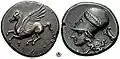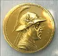 ستاتير ذهبي عائد لـالإسكندر الأكبر . لاحظ وجود أثينا وهي تعتمر خوذة وفي الخلف: الإله الإغريقي نايكي وهو يحمل قلماً وإكيلي. ويحتمل أنه سك في مدينة أبيدوس (قرب مضيق الدردنيل) بين 328-323 ق.م.