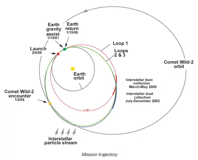 وعن طريق إجراء مناورة لاستخدام لجاذبية الأرض، حيث اقتربت المركبة من الأرض في يناير 2001، فأكسبتها جاذبية الأرض دفعة جعلتها تتخذ مدارا أوسع حول الشمس تتم فيه الدورة خلال سنتين ونصف. وتلى ذلك أن أتمت المركبة دورتين حول الشمس قبل أن تقترب من الأرض مرة ثانية في يناير 2006، وارسلت الكبسولة إلى الأرض.