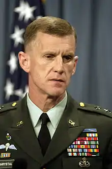 ستانلي ماكريستال ألين (ولد في 14 أغسطس 1954) هو قائد عام في جيش الولايات المتحدة. وكان قائد القوة الدولية للمساعدة على ارساء الامن (ايساف) وقائد القوات الأمريكية في أفغانستان] [أوسفور] ألف). وشغل سابقا منصب مدير هيئة الأركان المشتركة من آب / أغسطس 2008 إلى يونيو 2009، وقائدا، قيادة العمليات الخاصة المشتركة 2003-2008، حيث كان له الفضل مع وفاة أبو مصعب الزرقاوي، زعيم آل كان يعرف يقال تنظيم القاعدة في العراق، لكنه انتقد أيضا لدوره المزعوم في التستر على الحادث بات تيلمان بنيران صديقة. ماكريستال لقوله، والتفكير في ما غيره من قادة الجيش يخشون، واحدة من الأسباب التي ذكرت ل تعيينه لقيادة جميع القوات في أفغانستان، وهو المنصب الذي عقد في الفترة من 15 يونيو 2009، إلى 23 يونيو 2010. وعقب تصريحات اللب عن نائب الرئيس جو بايدن ومسؤولون في الإدارة أخرى منسوبة لمساعدي ماكريستال في مقال رولينج ستون، ماكريستال وأشير إلى واشنطن العاصمة حيث كان الرئيس باراك أوباما قبلت استقالته. وبعد الاجتماع، انه يشعر بالارتياح لقيادته والجنرال البريطاني السير نيكولاس "نيك" يفترض باركر قيادة مؤقتة للقوة الدولية للمساعدة على ارساء الامن في أفغانستان. عين الرئيس باراك أوباما الجنرال ديفيد بتريوس خلفا ماكريستال في انتظار مصادقة مجلس الشيوخ.